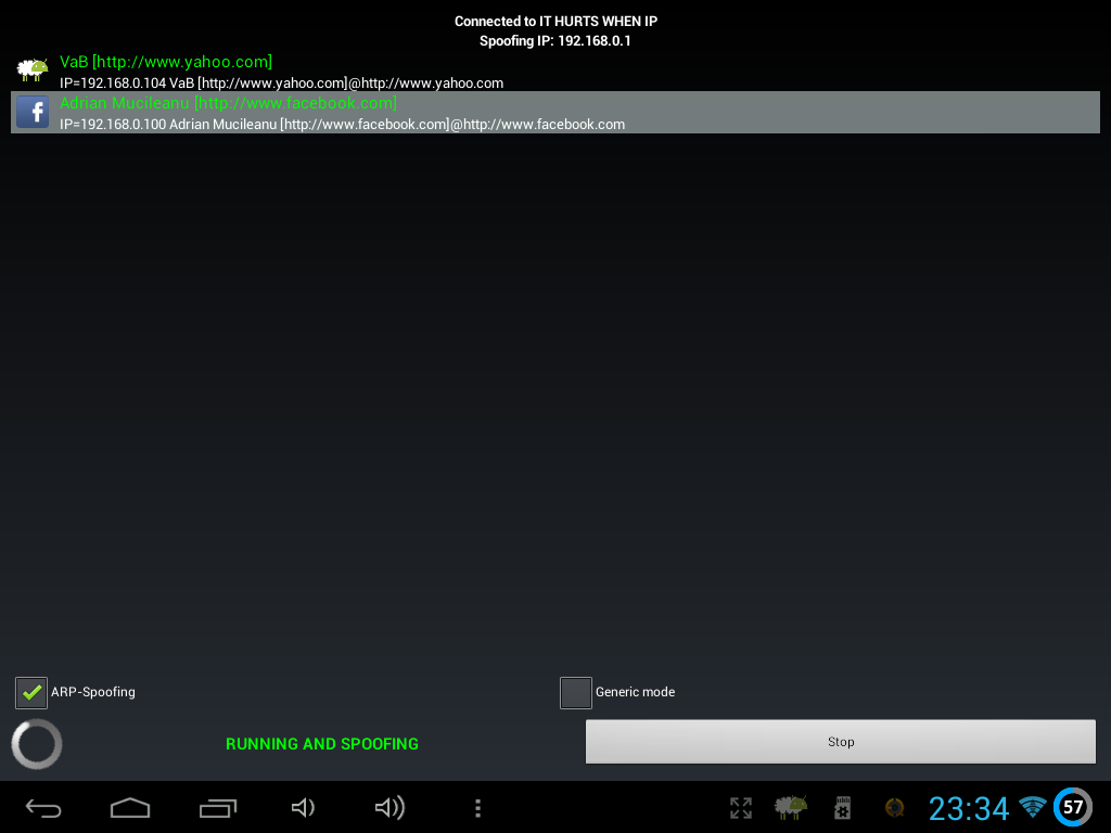 Nu am găsit un sniffer serios, mai mult interfeţe pentru tcpdump care salvează tot ce scanează în reţea într-un fişier ce necesită a fi descărcat în PC, în programe precum Wireshark. Nu prea folositor. Printre aplicaţiile testate de mine se numără şi DroidSheep - un sniffer specializat pe furtul sesiunilor de Facebook, Twitter, LinkedIn, Yahoo şi altele. Pornesc aplicaţia (care face şi spoofing - lucru bun) şi apare în listă un profil de Facebook, al unuia din noii colegi de cameră. Interesant, oricum uitasem cum îl cheamă aşa că aplicaţia şi-a dovedit cât de cât utilitatea. Mai apar şi în listă şi două conturi de Yahoo, moment în care am inspiraţia să apăs cu degetul pe o intrare din listă - hopa, reacţionează. Apare un meniu, iar unul din ele zice Open site. Activez opţiunea şi - surpriză - mă trezesc în contul de mail al colegului. Am rămas perplex şi următorul pas a fost să fac o donaţie dezvoltatorului aplicaţiei (care este open-source, btw) pentru a-i răsplăti ingeniozitatea.